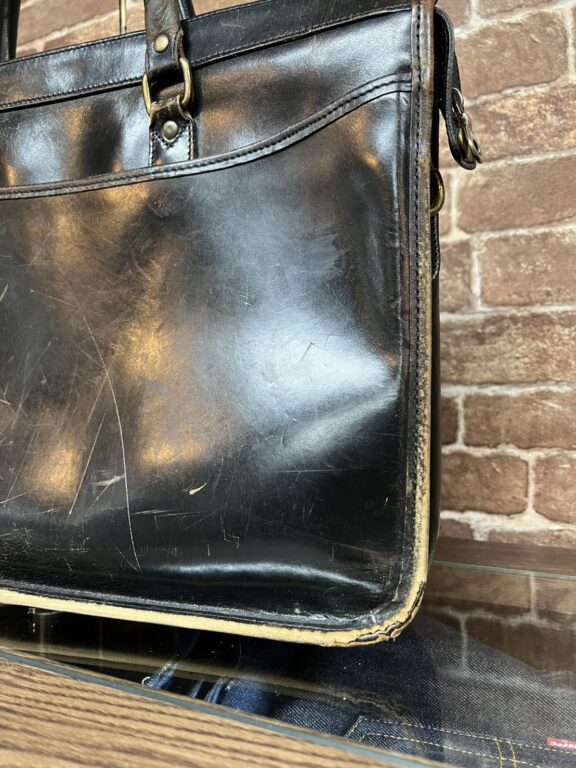 強い力が加わりやすいショルダーベルトは、レザーが千切れてしまったり、裁断面のコバが剥がれてボロボロになってしまうことがあります。