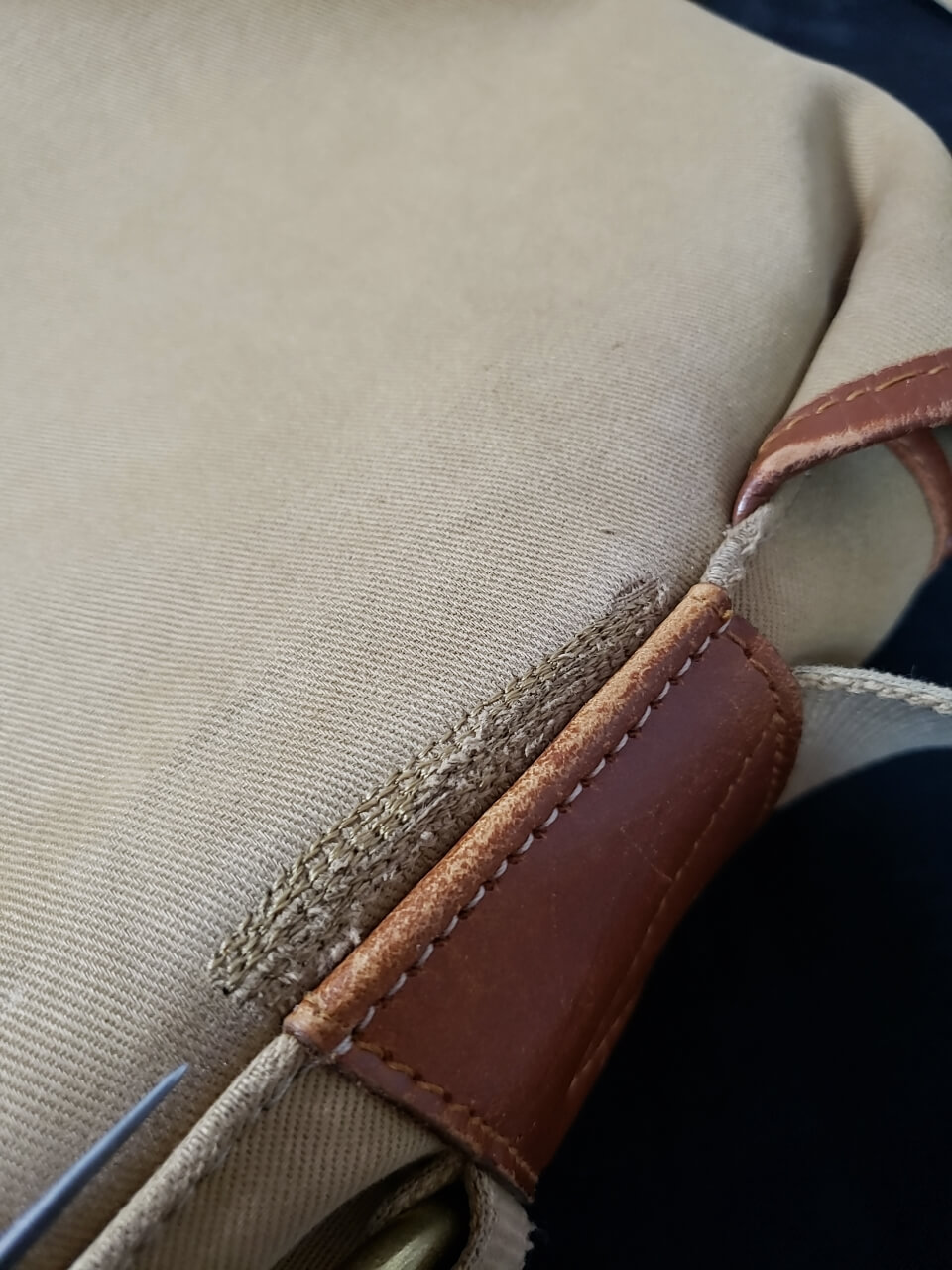 ショルダー付け根や底角、ファスナー周りなど負荷が集中する箇所は、繰り返しの引張りや折れ、擦れによって繊維が徐々に疲労します。これは長年の使用で避けられない現象です。