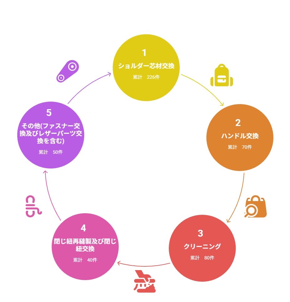 弊社でのプラダリュック製品での前年度実績は以下の通りになります。特にショルダー芯材交換の交換についてはこちらの記事でもご紹介している内容のようにウレタンの芯材の加水分解の劣化により使用が困難となり、今年度もご相談を多く頂いております。